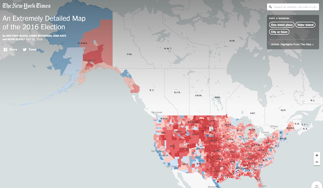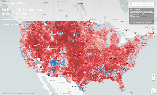 There's some irony in the map too. San Bernardino county is the largest in the US. It's down in the bottom left corner in California. It's blue. Yes, at a county level Clinton won it but 95% of this county is unpopulated. So there's actually more blue on the map as a function of this county's size and shape than needed to have been on the map if another cartographic technique had been used.