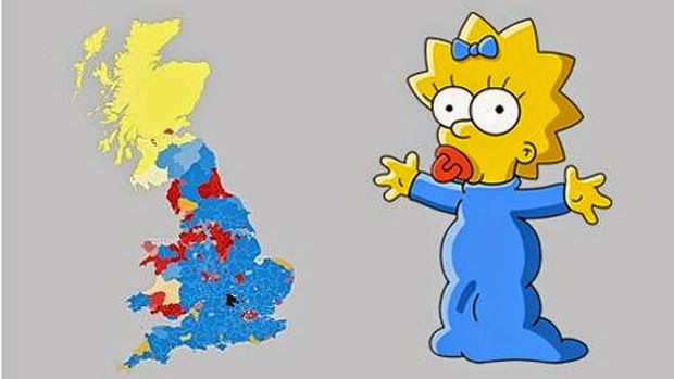 It soon became clear that the Scottish National Party were sweeping Scotland with a swathe of yellow constituencies. With much of the rest of England and Wales being coloured blue or red, the comparisons with Maggie Simpson began proliferating our social media feeds.