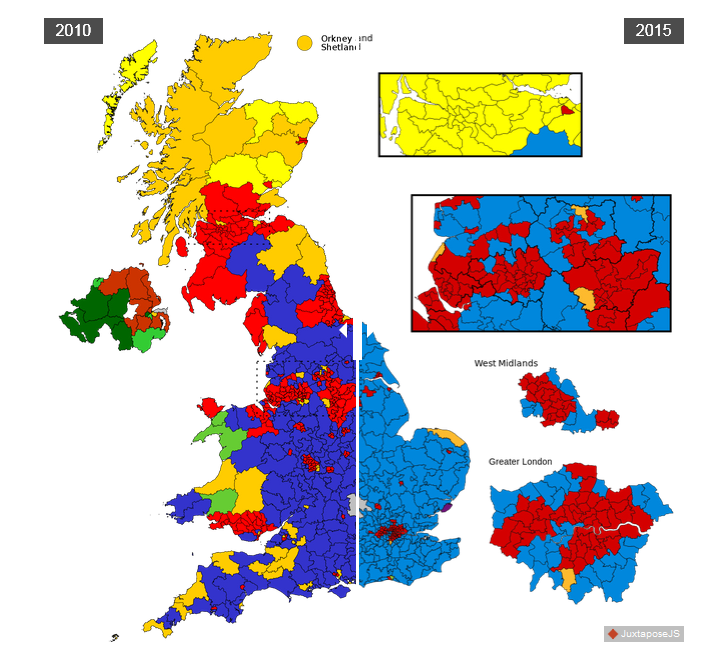 Politically, the Conservative's couldn't have imagined such a result; a majority from seemingly out of nowhere and against all the polls. Labour were trounced and no more so than in Scotland where the Scottish National Party all but turned the map from red to yellow. The UK Independence Party did well in vote share (12.6%) but this translated into only one Parliamentary seat.