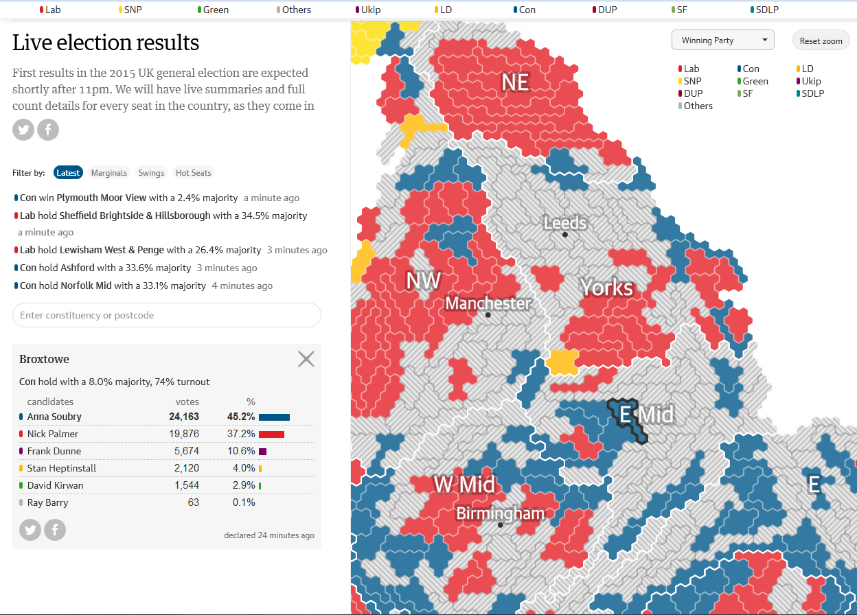 The BBC web site (and many of their other digital mapping) curiously did not go for hexagons which they had used successfully in 2010. An odd decision and with their under-used giant hex-map they dropped the ball a little in mapping terms.