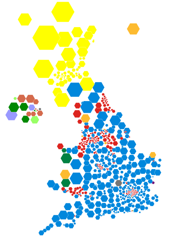 Others filled their boots as the results rolled in and web maps began to be coloured in. The Telegraph used a hexagonal cartogram, as did Sky News