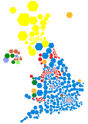 Alternatively, cartograms offer a form of thematic mapping that accommodates the difference in size of areas. There are plenty of alternatives. The Gastner-Newman population density equalizing cartogram tries to preserve some sense of geography while squeezing and stretching shapes. It appears a little odd to some people. The DeMers uses squares, the Dorling uses circles; both perfectly good shapes and then...there's the hexagon. Here's the 2010 results again, this time mapped with equally sized hexagons.