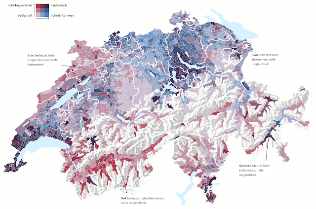 Bivariate choropleth maps are hard. You have to limit the number of classes to an absolute minimum, maintain a sensible classification, and still allow the reader to see the relationship between two variables. This map does that job perfectly (also on the interactive version). But what I really like about this map is there's no spurious shading where there are mountains and no people. All too often we overlay arbitrary enumeration areas across geographies that exhaust space but fail miserably to show the differences between where people are and where they are not. I love that this map made the effort, and also still managed to add interest with a hillshade. It's Switzerland after all.